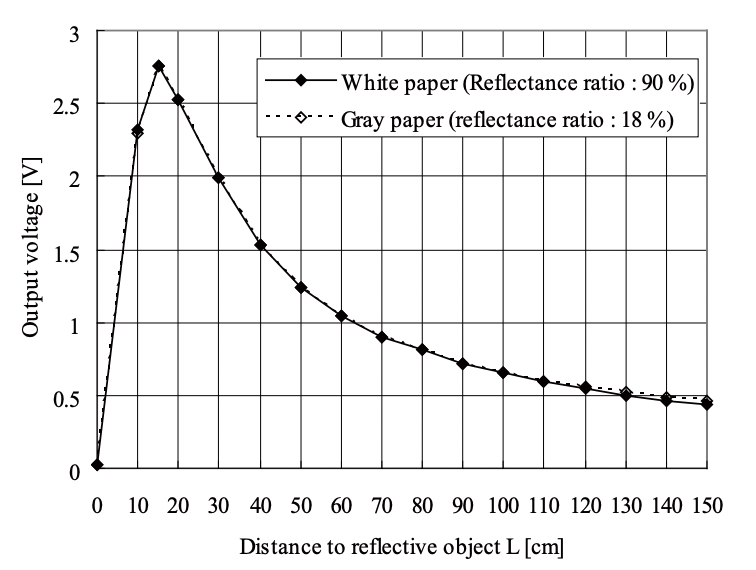 ADC port로 읽어들인 12bit voltage 값을 실제 거리로 변환해야 했다. GP2Y0A02YK0F 센서의 데이터시트를 보면 거리특성은 위 그림과 같다. 이에 맞게 변환을 해야 센서가 보증하는 거리값을 구할 수 있다. 근데 아주 정밀한 값을 구하는 것이 목적이 아니고, 물체 유무만 판단하면 됐기에 그냥 대충 linearization해서 거리값으로 변환했다. 이 값을 바탕으로 물체의 존재 여부를 파악한다.