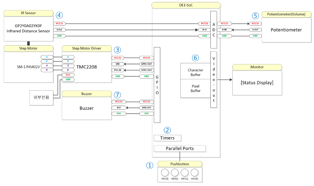 System에서는 step motor제어, sensor reading, display 등 여러 routine이 수행되고 있어야 하므로, state간 전환과 제어 flag들의 조정을 pushbutton의 interrupt를 통해 제어한다.