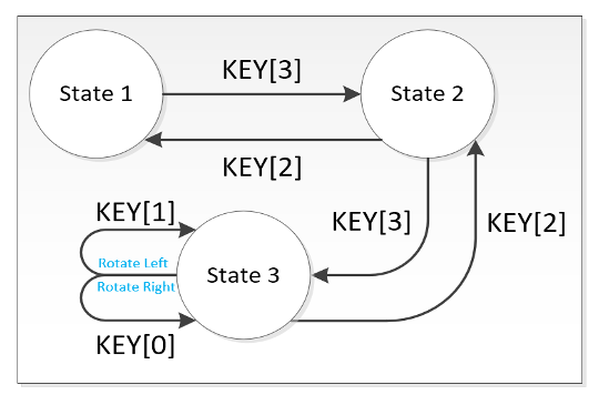 관제상황 display, step motor의 manual/auto 조정, step motor 수동조작 등, 관리자가 다양한 제어상태 사이를 전환할 수 있도록 FSM을 구성하였다. 각 state는 pushbutton을 통해 전환한다. 다양한 logic들이 수행되어야 하기 때문에, pushbutton의 입력을 interrupt handling으로 처리하여 state간 이동과 제어 flag 변화를 구현하였다.