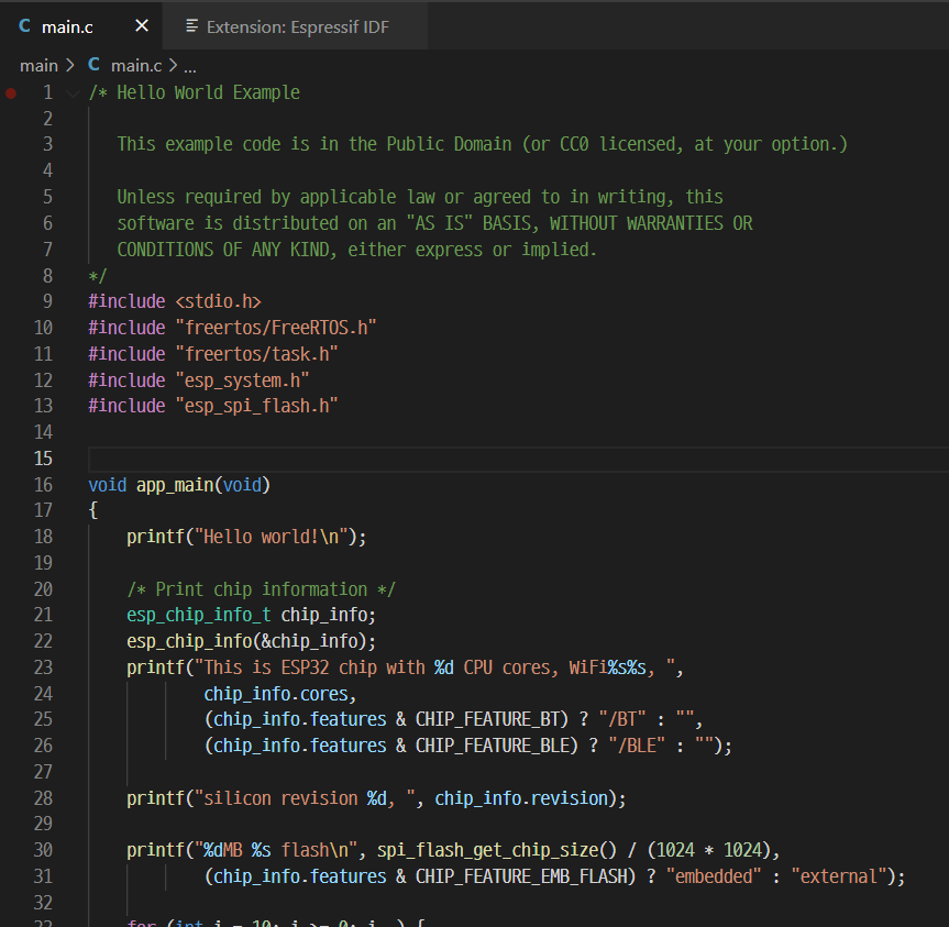 위의 Extension을 통해 ESP-IDF framework를 설치하고 Hello World 예제를 수행시키는 과정은 아래와 같다.