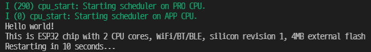 VSCode의 아래쪽을 보면, 위와 같은 버튼들이 있다. 4개의 버튼은 왼쪽부터 순서대로 'Build Project', 'Flash Device', 'Monitor Device', 'Build, Flash, Monitor' 버튼이다. 가장 우측 버튼을 누르면 build부터 terminal을 통한 monitoring까지 한번에 수행된다. 처음에는 시간이 다소 소요된다.