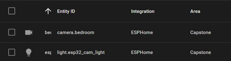 그리고 Home Assistant에서 ESP32-CAM device의 camera와 flashlight를 HA entity로 등록한다.