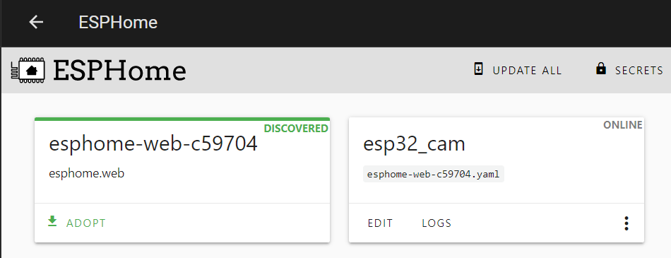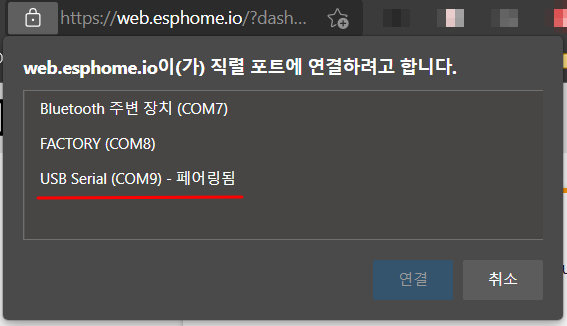 ESPHome에서는 web dashboard를 제공해서, compile과 flashing을 위한 별도 설치가 필요없다. ESP32-CAM을 USB Serial port에 연결해 두었다면, 위처럼 인식하고 web에서 compile과 flashing작업을 모두 수행할 수 있다.