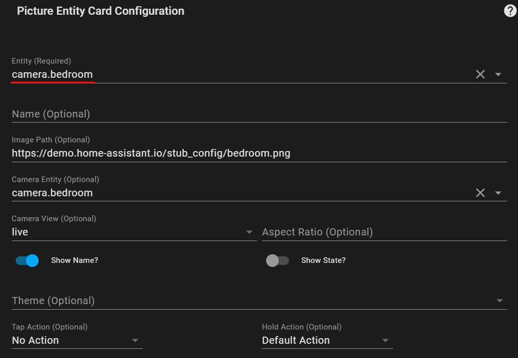 이 entity를 HA의 Lovelace UI에서 'Picture Entity Card'에 등록한다. 우선은 camera entity만 넣었다. Flashlight entity도 넣으면 card의 toggle 등을 통해 HA에서 ESP32-CAM의 flashlight를 제어할 수 있다.