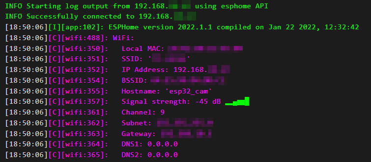 ESP32-CAM device가 WiFi에 성공적으로 연결되면, ESPHome의 web dashboard에서 위처럼 log를 확인할 수 있다.