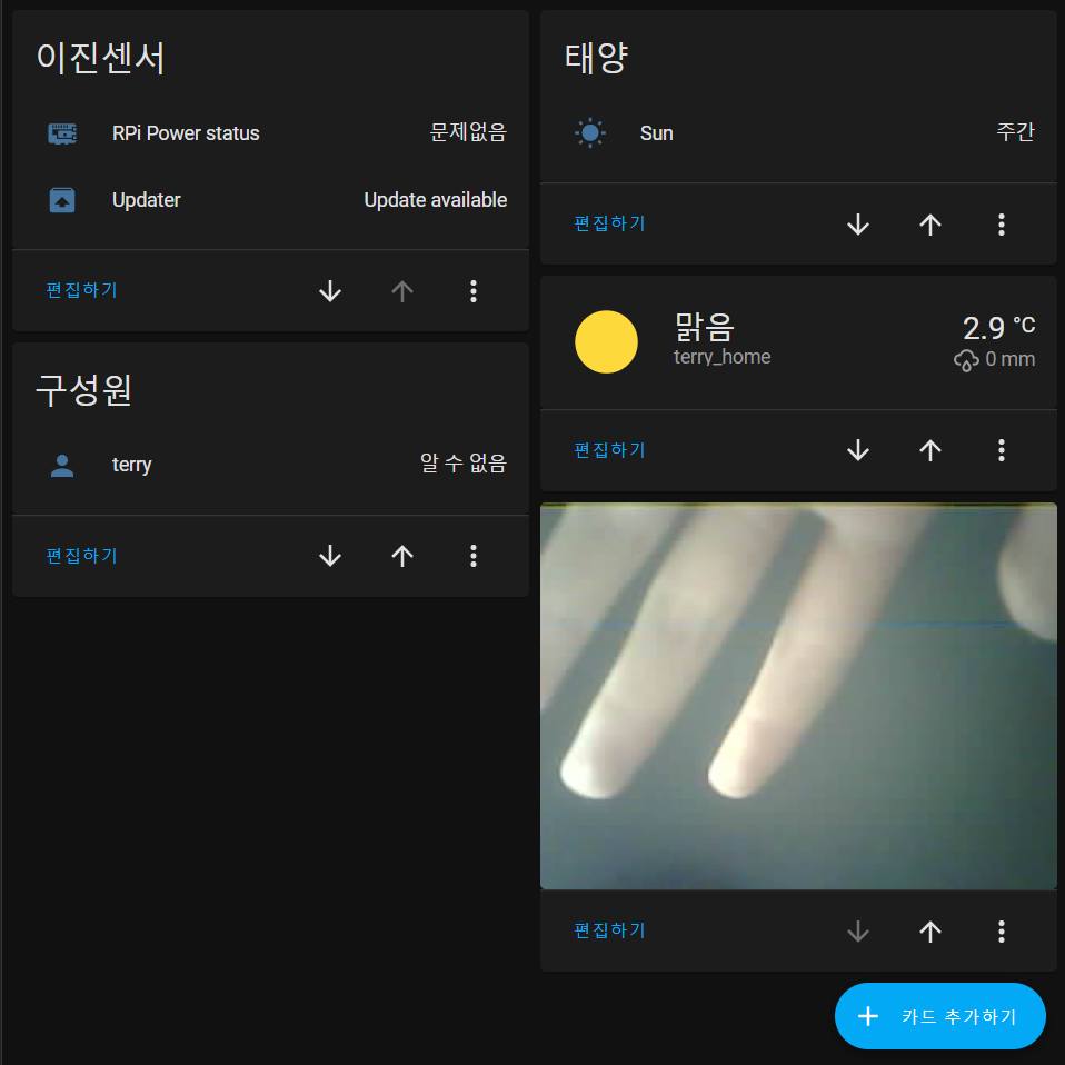 코드를 ESP32-CAM에 올리고 동작하고, HA에서는 위처럼 Picture Card에 HTTP URL로 접속하였다.