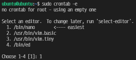 처음 실행할 경우 crontab을 편집하기 위한 editor를 선택할 수 있는 메뉴가 뜬다. 일단은 nano를 사용했다.